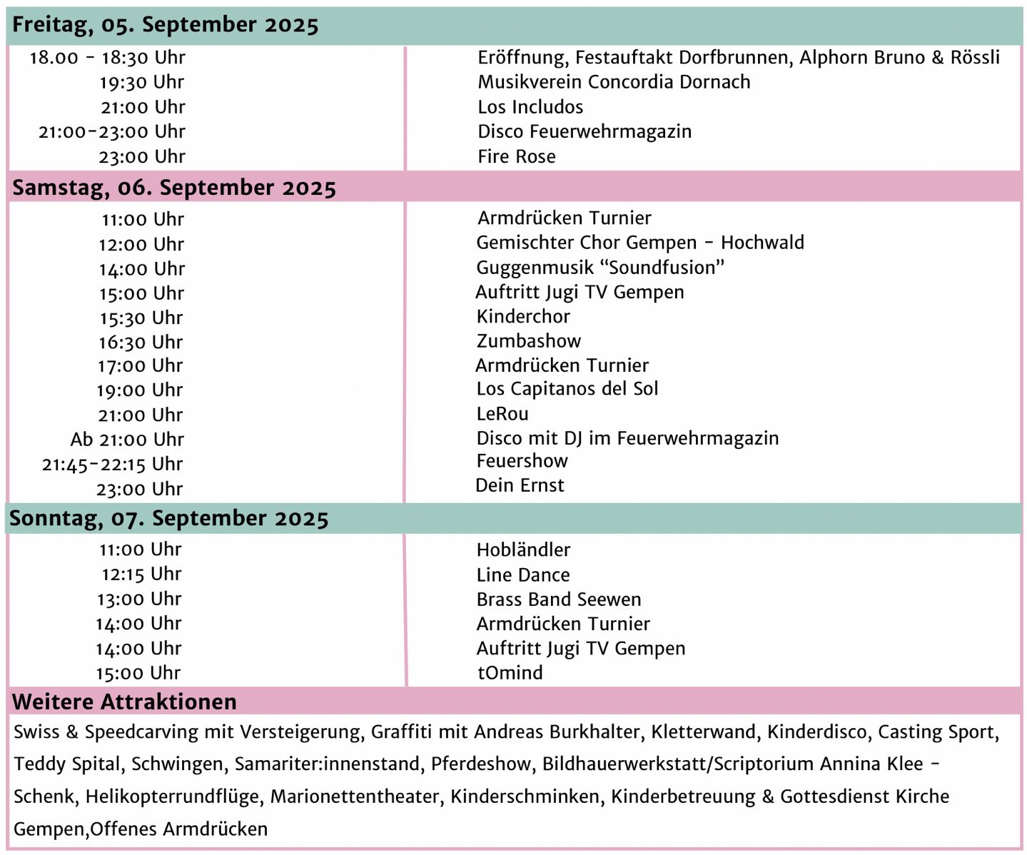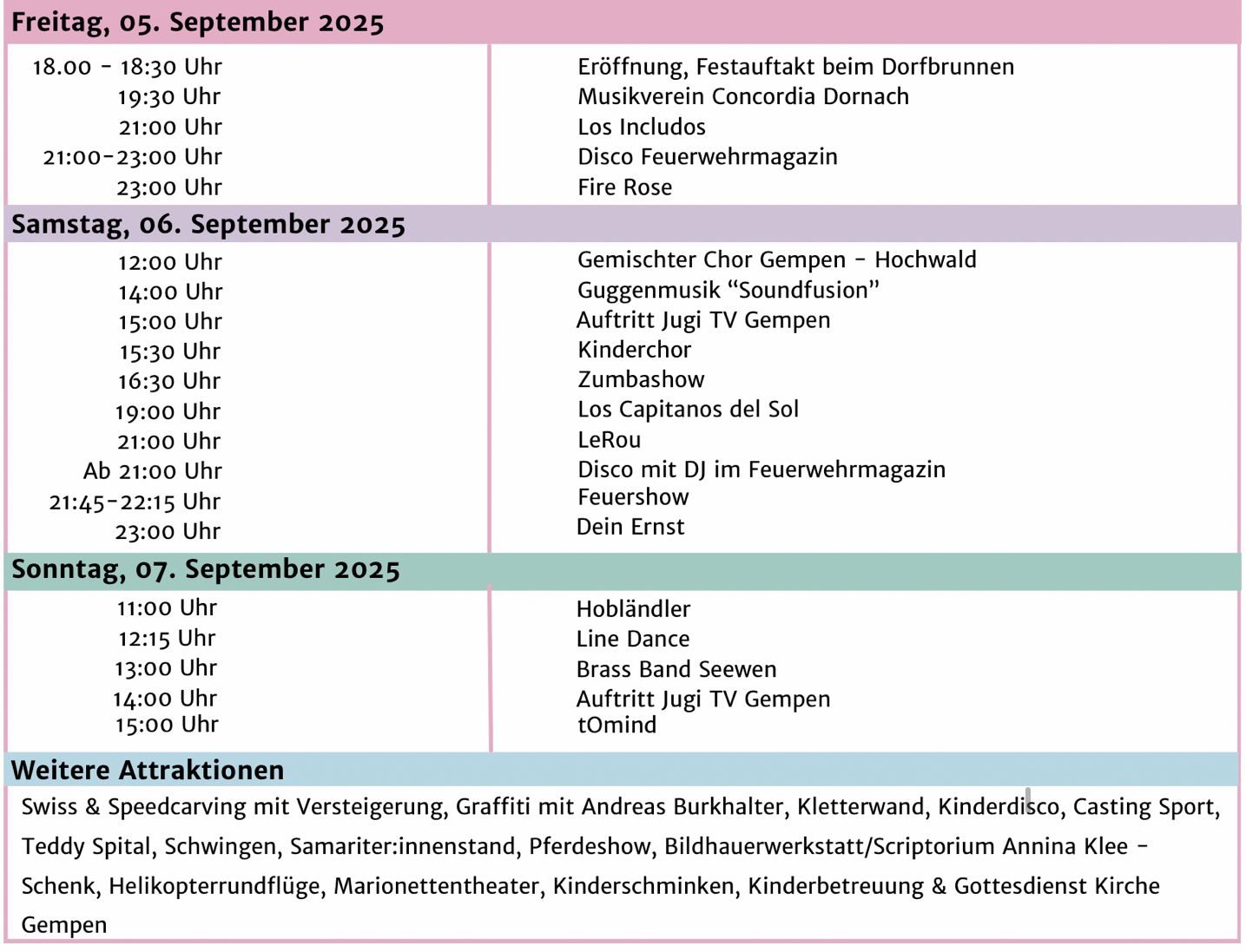 Nach einer langen Pause ist es endlich wieder soweit! Vom 5. bis 7. September 2025 findet zum 18. Mal das Gempenfest statt. Freut euch auf neue Attraktionen, spannende Aktivitäten und unvergessliche Erlebnisse für die ganze Familie. Mit einem frischen und motivierten OK-Team sind wir bereit, dieses Fest zu einem besonderen Highlight zu machen. Erlebt die lange Tradition und die einzigartige Atmosphäre, die unser Dorffest so besonders machen!